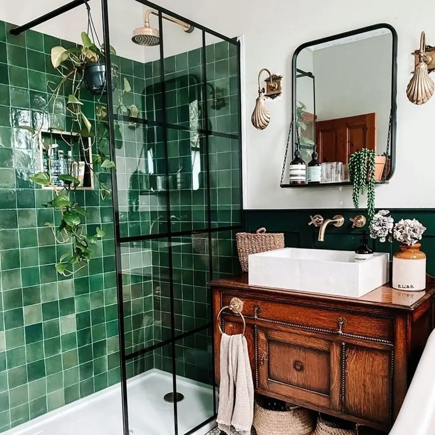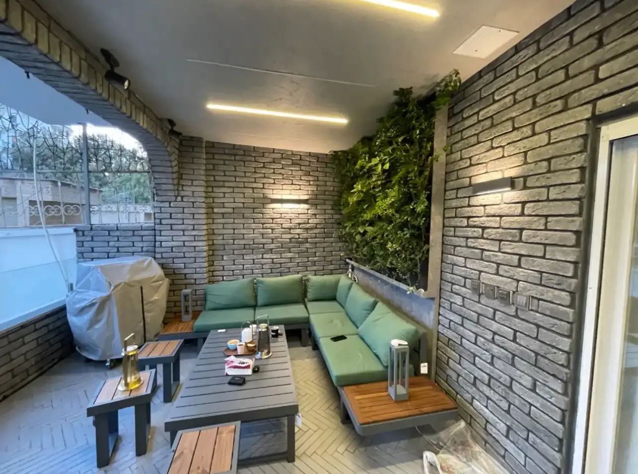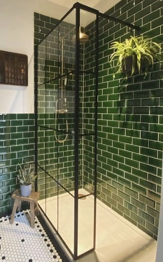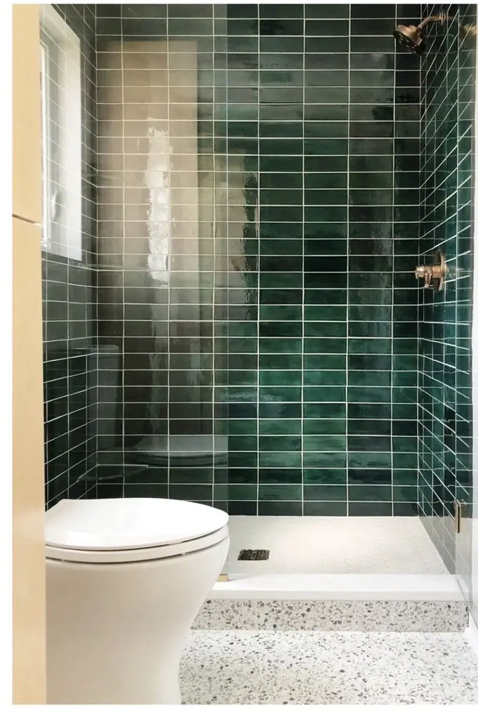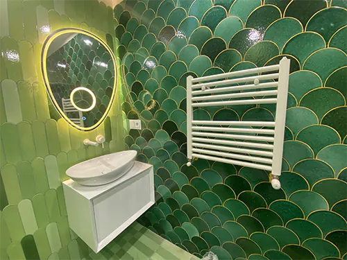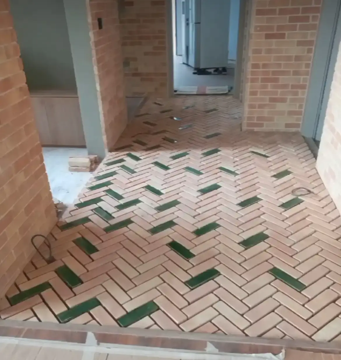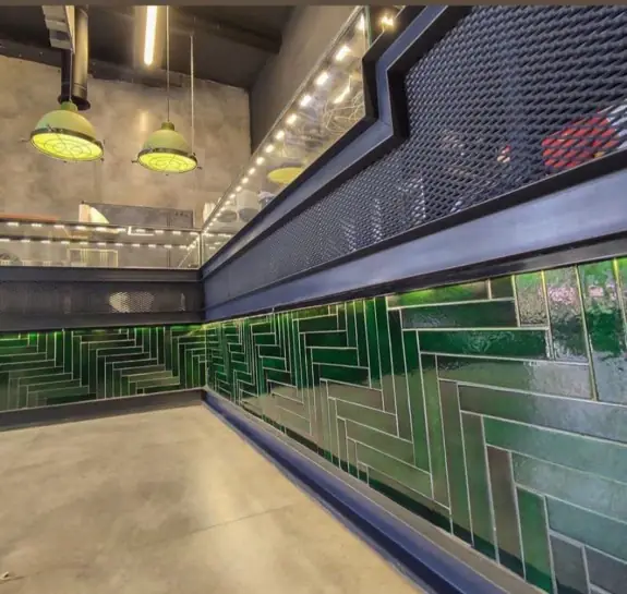 کاشی دستساز رنگ سبز رولکسی ترکیبی با آجر چینش جناقی