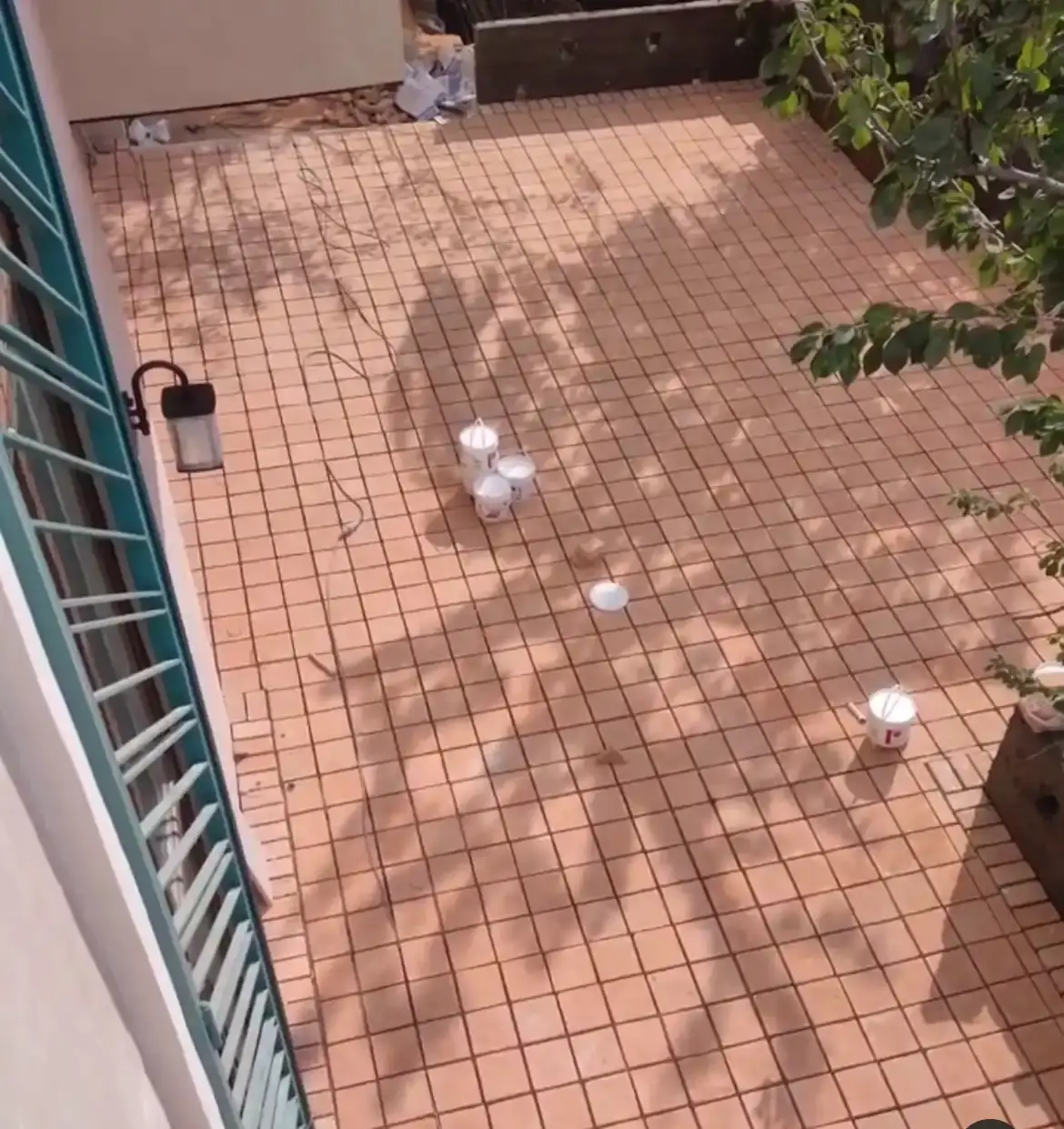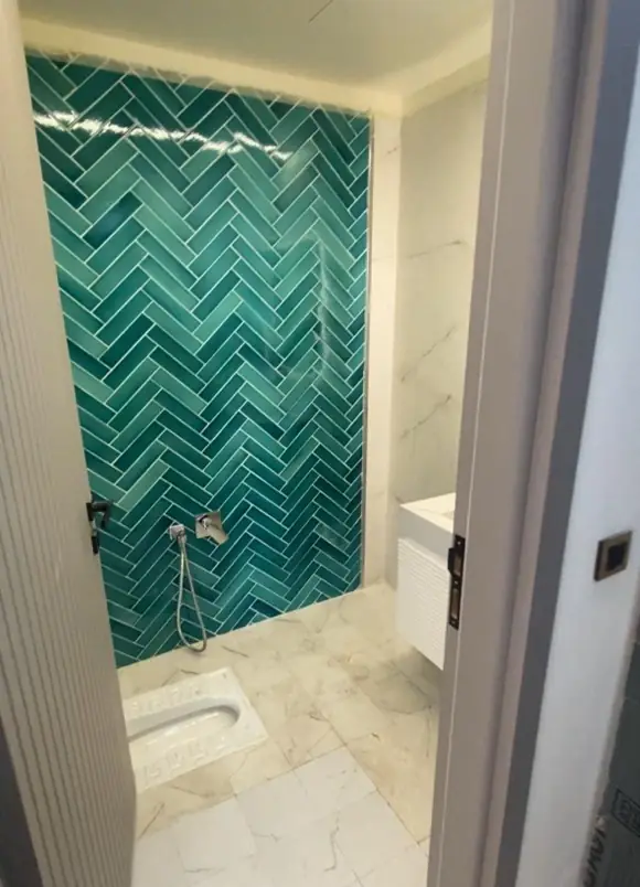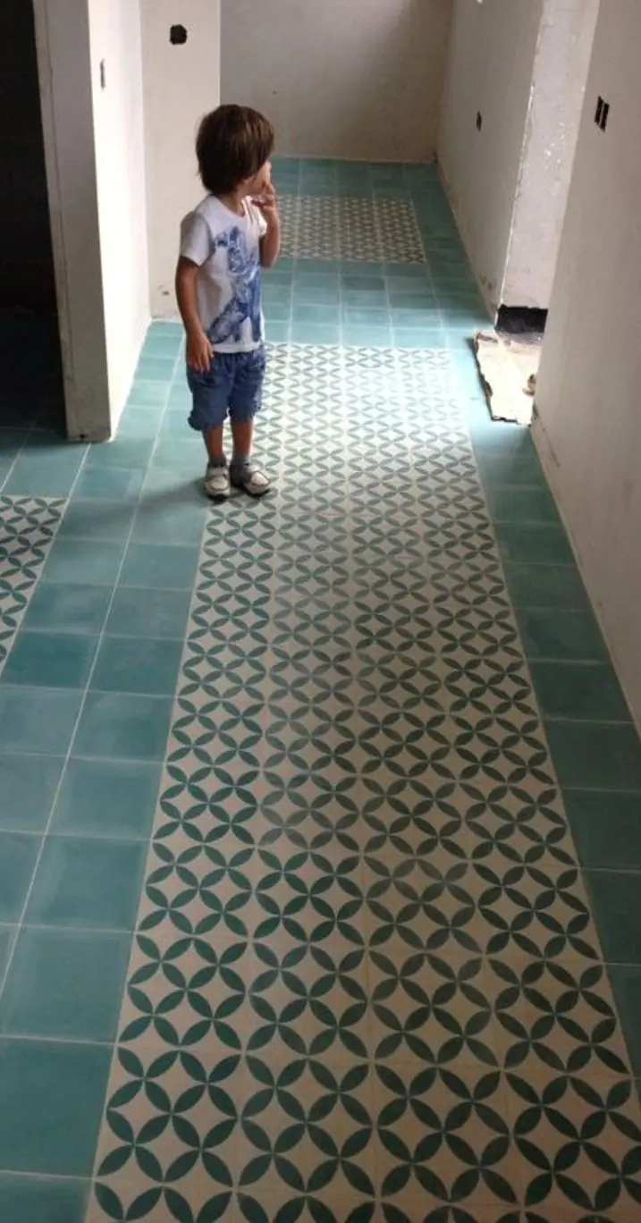 کاشی دستساز کف رنگ فیروزهای ترکیبی با کاشی طرحدار
